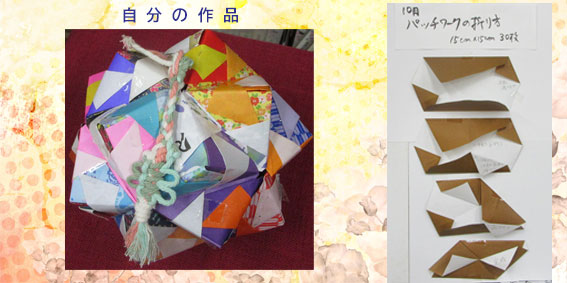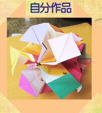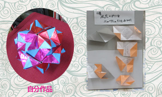 自分作品は風に吹かれて花が舞うのをイメージして色紙を折りました。 |