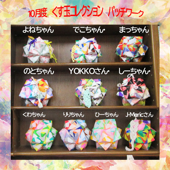 10月くす玉コレクションパッチワーク 色紙によりそれどれの個性が出て面白いと思いました。マクラメの飾りも素敵です。