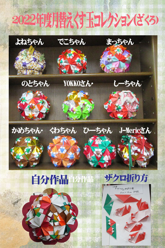 9月くす玉コレクションまだまだ暑い日が続きますが、穴を開けた涼しげな組み方に、色とりどりの作品を楽しませて頂きました。 |