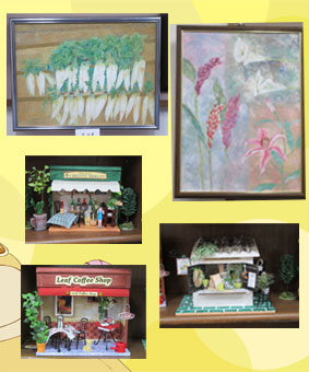 | りりちゃん メモリアル 九州長崎の里帰り故郷のお友達、ご家族に会われお墓参りをされ安堵されたことでしょう。共にJPCでがんばりましょう。 | はーちゃん 買い物袋とクッションカバー ショッピングが楽しみですね。えこばっぐ。はーちゃんのアイディヤー素晴らしい。役にたってよかったわ(モチーフ) | 瑞木さん 日本画とドールハウス 繊細なタッチで描かれています。大根の葉が立体的に見えます。素晴らしいです。ロールハウスの細かい仕事、根気がいります脱帽 |