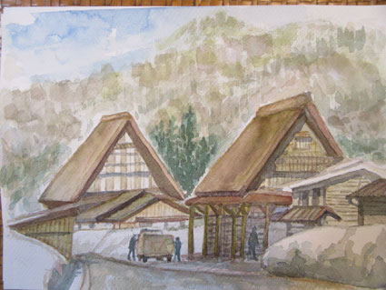 冬の白川郷 毎年雪が降るとこのように雪かきをしておられるのでしょうね。透明水彩画で描きました。 |