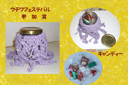 参加証で頂いたマクラメボトルワークです。先生が丹精込めて作って私たちに下さいました。有難うございました。この中にキャンディーを入れています。 |