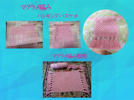7月ミニ展示会に出品しました。(ハンキングバスケット) マクラメ編みの敷物は思い付きでテーブルの上に敷くのに適当なものと編み方を先生に教えて頂いて作品にしました。 9月に出品します。