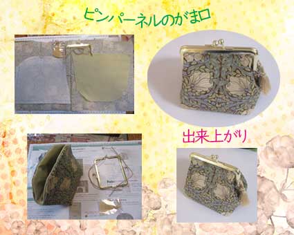 ピンパーネルのがま口 これは夏の抽選会で頂いたものです(私はがま口のポーチが好きです作るのも口金以外割合簡単でした。)重宝します。有難うございました。 |
