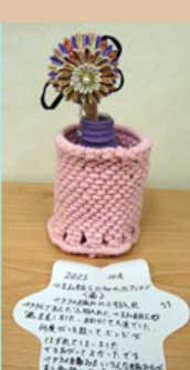 のとちゃん・マクラメ「ポトルワーク」何とか形になりました。花を生け止める工夫も教えて頂きました。 |